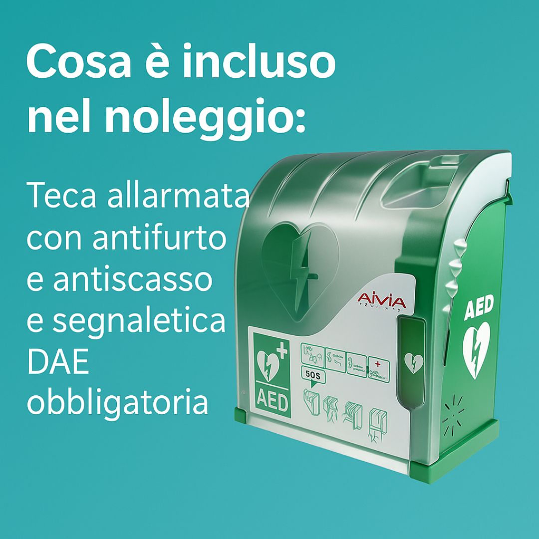 Noleggio defibrillatore semi automatico DAE con controllo remoto e teca allarmata da interno in formula DAE pro interno specifico per Hotel, Centri Commerciali, Cinema e grandi strutture commerciali