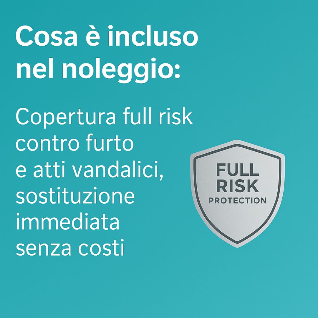 • Assicurazione Completa: Copertura Full Risk contro Furto e Atti Vandalici, garantendo la sostituzione immediata senza costi a vostro carico.