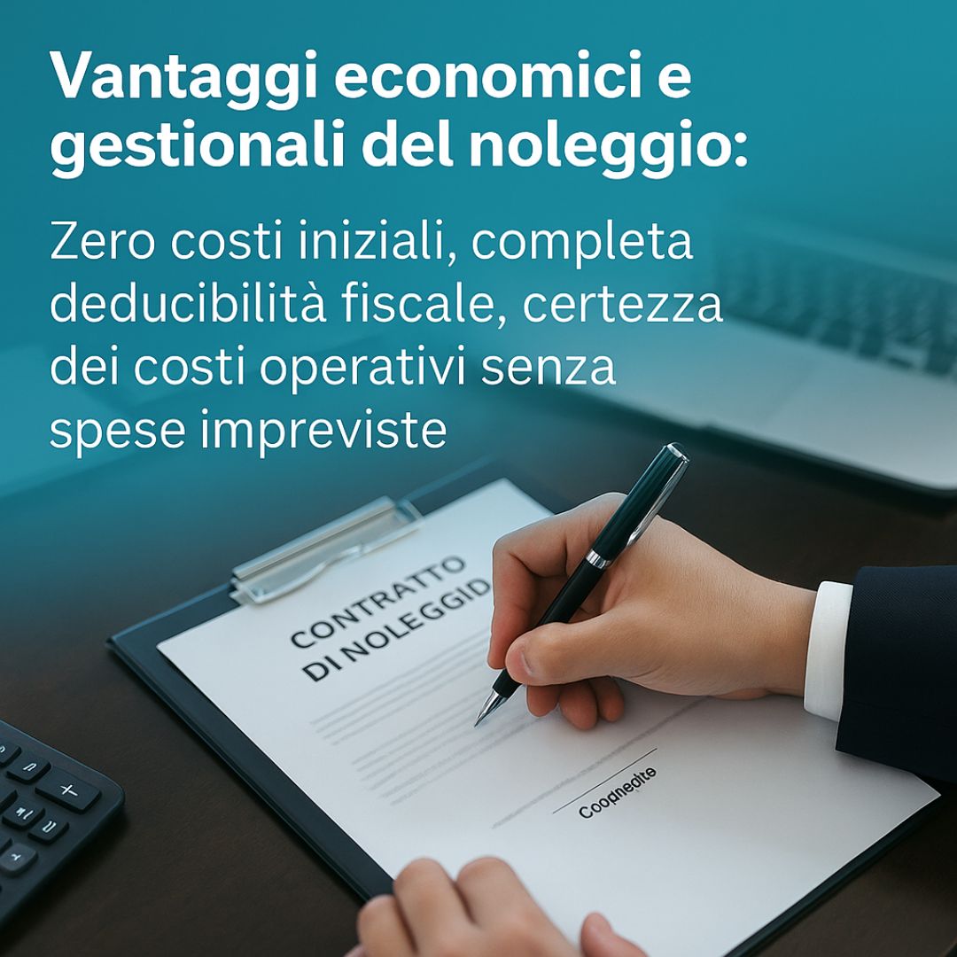 • Completa Deducibilità Fiscale: Il canone di noleggio è interamente deducibile come costo operativo (a differenza dell'acquisto che prevede ammortamento), con vantaggi fiscali su IRES e IRAP.